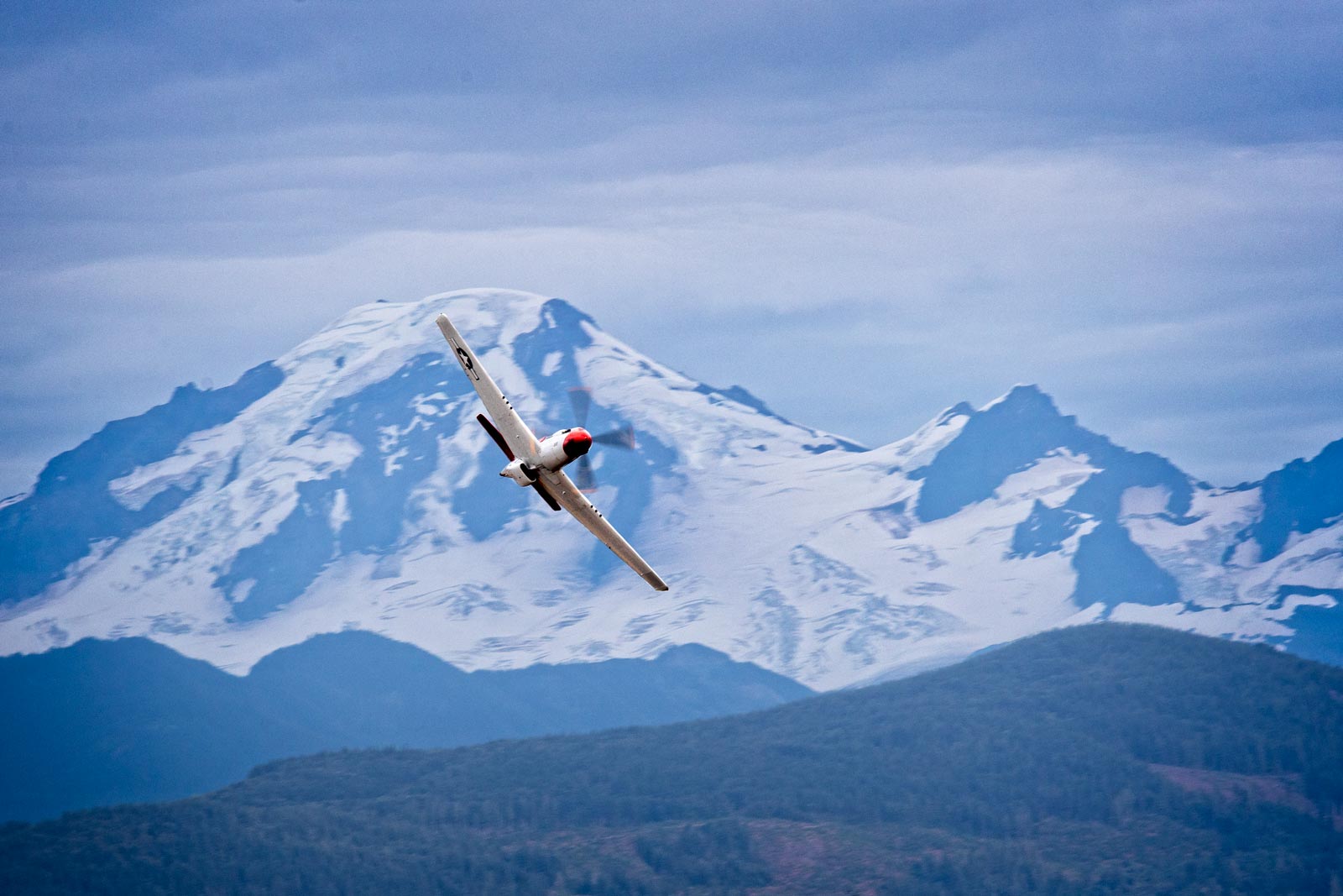 Mount Baker is an old volcanic mountain in Washington State just south of Abbotsford. The mountain is visible across the Abbotsford air field and is seen here with a P-51 approaching to do a high speed pass of the crowd.