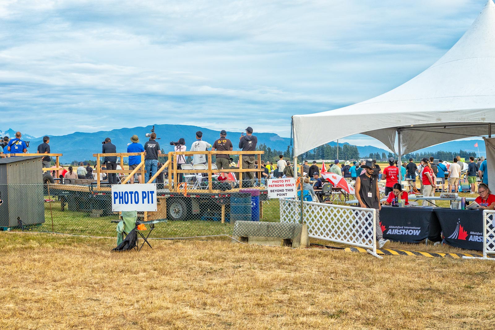 For the last three years at this airshow I have bought tickets to the Photo Pitt which is preferred seating right on the edge of the runway. The ticket included airshow admission and parking, entrance to the Photo Pit, and complimentary lunch and drinks. There are raised platforms for getting pictures over the heads of people below. Seating is at round tables with umbrellas to protect from the sun. Of course you are free to come and go to all display areas and to access the food and souvenir booths.