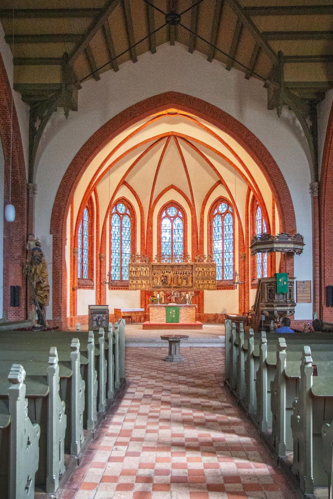 We had no particular plan to our walk but were simply following where curiosity led us. We came upon the Kirchenplatz, or church square, where the red brick Lutheran church of Warneműnde stood. It dated from 1871 and as it was open we went in.