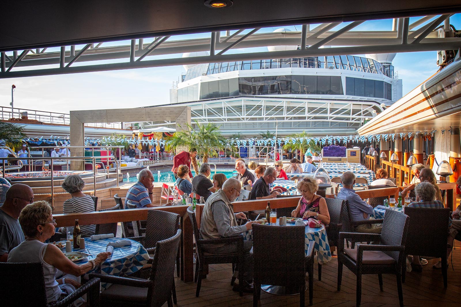 The Lido deck pool had been covered over, penants had been strung across the pool deck, tables had been set up and and a feast had been laid on. Local provisions had been obtained on shore for an evening party with a strong German flavour. There was local bread, beer, sausage and sauerkraut. And there was the Rostock Brass Band!